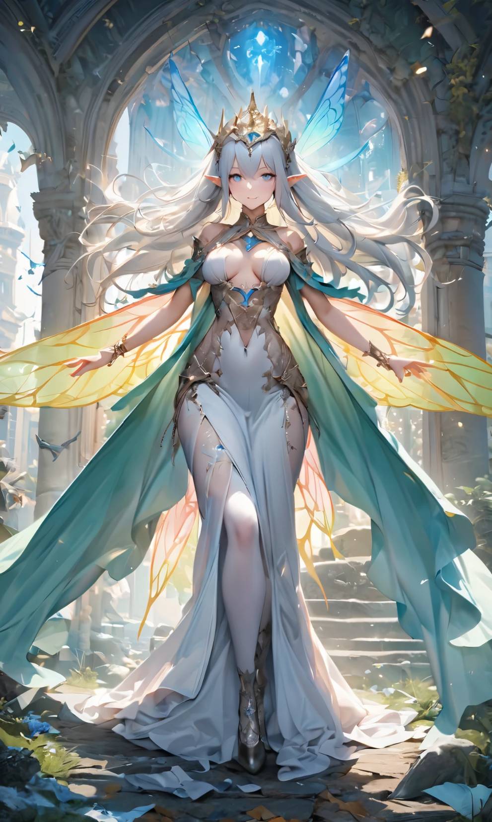 A radiant fairy queen adorned in golden wings, ruling over a mystical forest realm. Digital: / A2 Print:
